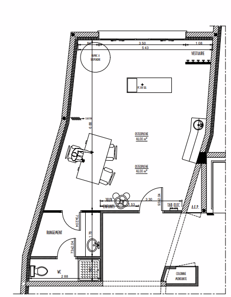 Un local d'environ 46 m² au 1er étage, composé d'un vaste bureau avec une salle de consultation, une salle d'eau et un WC.