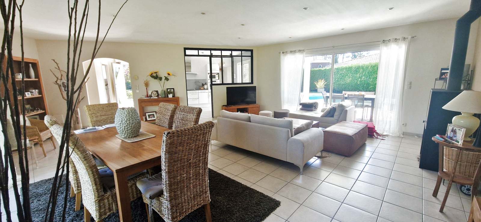 Elle se compose d’une entrée avec placard ouvrant sur un vaste séjour / salle à manger lumineux donnant sur la terrasse et la piscine, ainsi que d’une cuisine entièrement équipée avec cellier/buanderie attenant. Un dégagement dessert quatre chambres, dont une suite avec salle d’eau, un dressing, une salle de bain avec WC et un second WC indépendant.